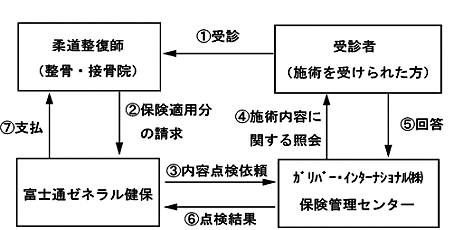 富士通ゼネラル健康保険組合はこの業務を点検機関「ガリバー・インターナショナル㈱」に委託しております。点検機関より皆様に、確認のための照会文書「柔道整復師(整骨院・接骨院)での受診に伴う確認について」を送付させていただくことがあります。封書が送られてきましたら、回答をご記入のうえ期限までに必ず「保険管理センター」宛にご返送下さい。